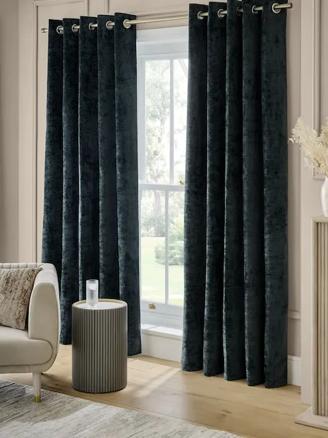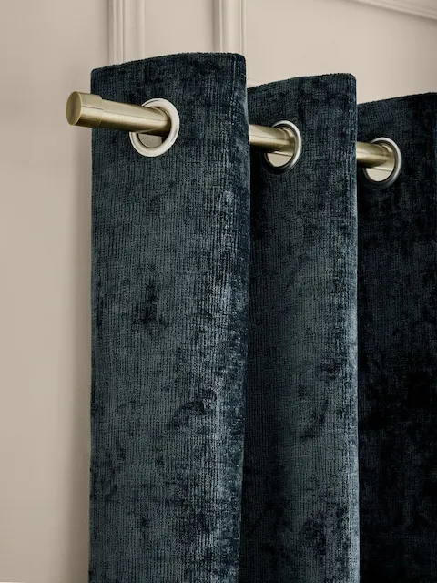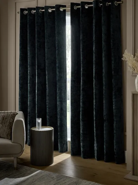 Navy blue plush chenille blackout curtains add a luxurious and sophisticated touch to any interior. The heavyweight fabric drapes elegantly, while the thermal lining helps regulate temperature, block light, and maintain warmth throughout the year. Eyelet headings ensure effortless hanging and a modern, clean finish for bedrooms and living spaces.