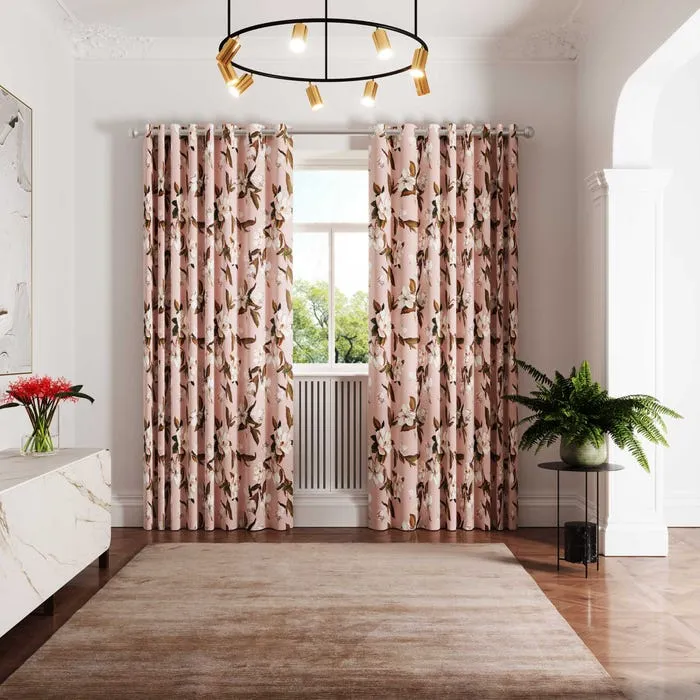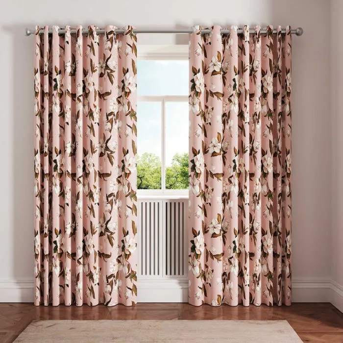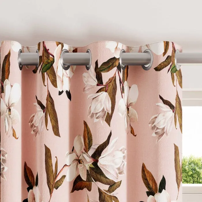 Opal Floral curtains in pink add elegance to your living room. Oversized blooms on textured cotton. Fully lined with matte silver eyelets for a perfect drape.